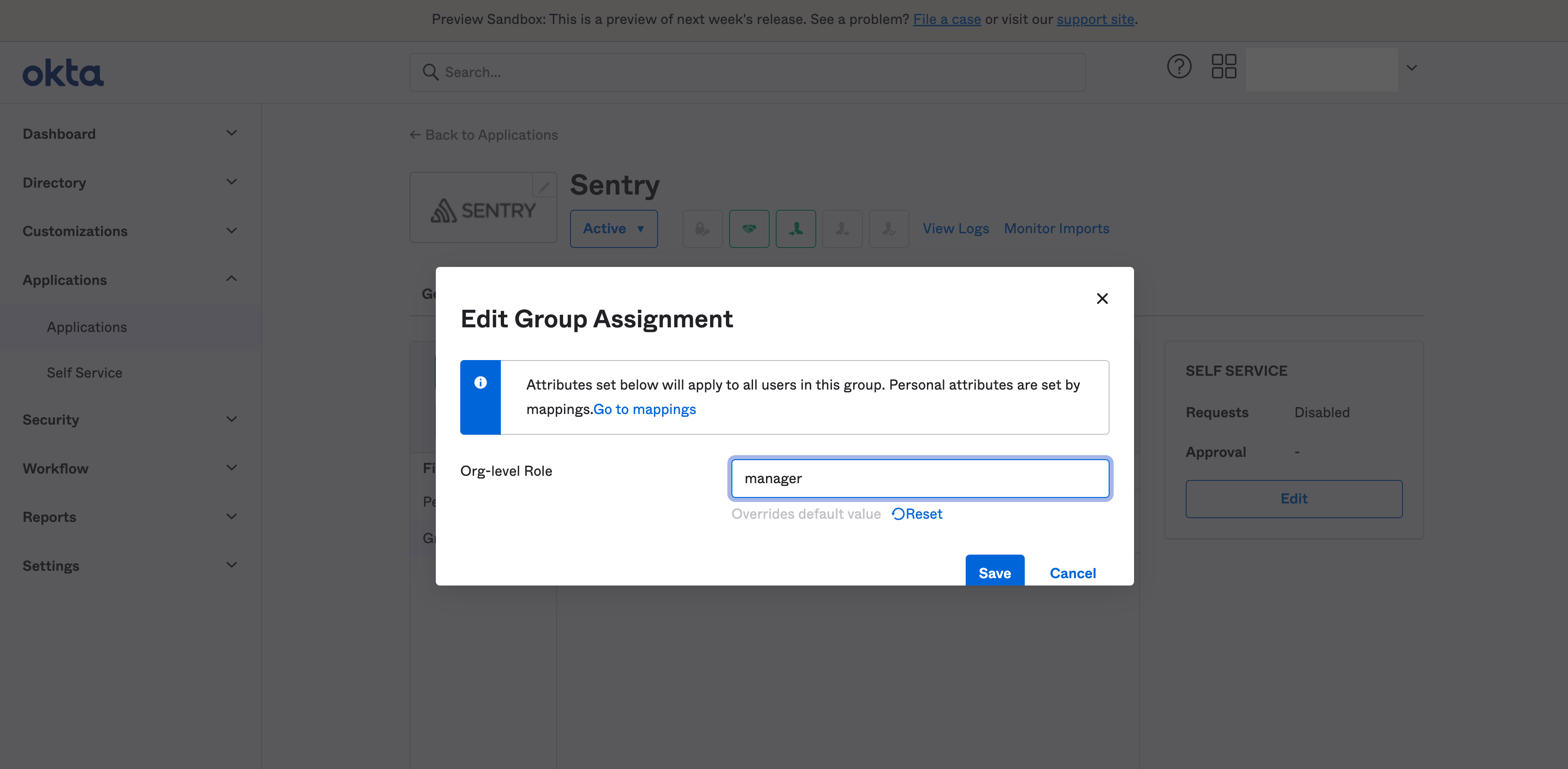 Currently, Sentry only supports the ability to update user attributes for organization-level roles. You'll be able to edit the attribute for users assigned to your application once you've added the sentryOrgRole attribute to your Okta application profile.