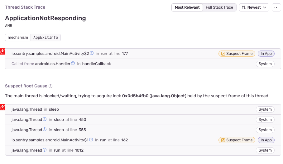 The new implementation (v2) uses the same data source as Google Play Console. This means the reported ANR events and ANR rate should match with what you see on Sentry. The new implementation also captures a thread dump with additional information, like held locks, to help you resolve ANRs more efficiently.