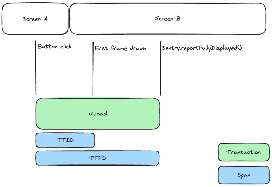 The span starts when the view of a view controller is loaded, and there is no other view controller transaction happening at the moment. The span finishes after the view appeared on the screen. The following chart shows how time to initial display (TTID) and time to full display (TTFD) correlate to transitions between activities: