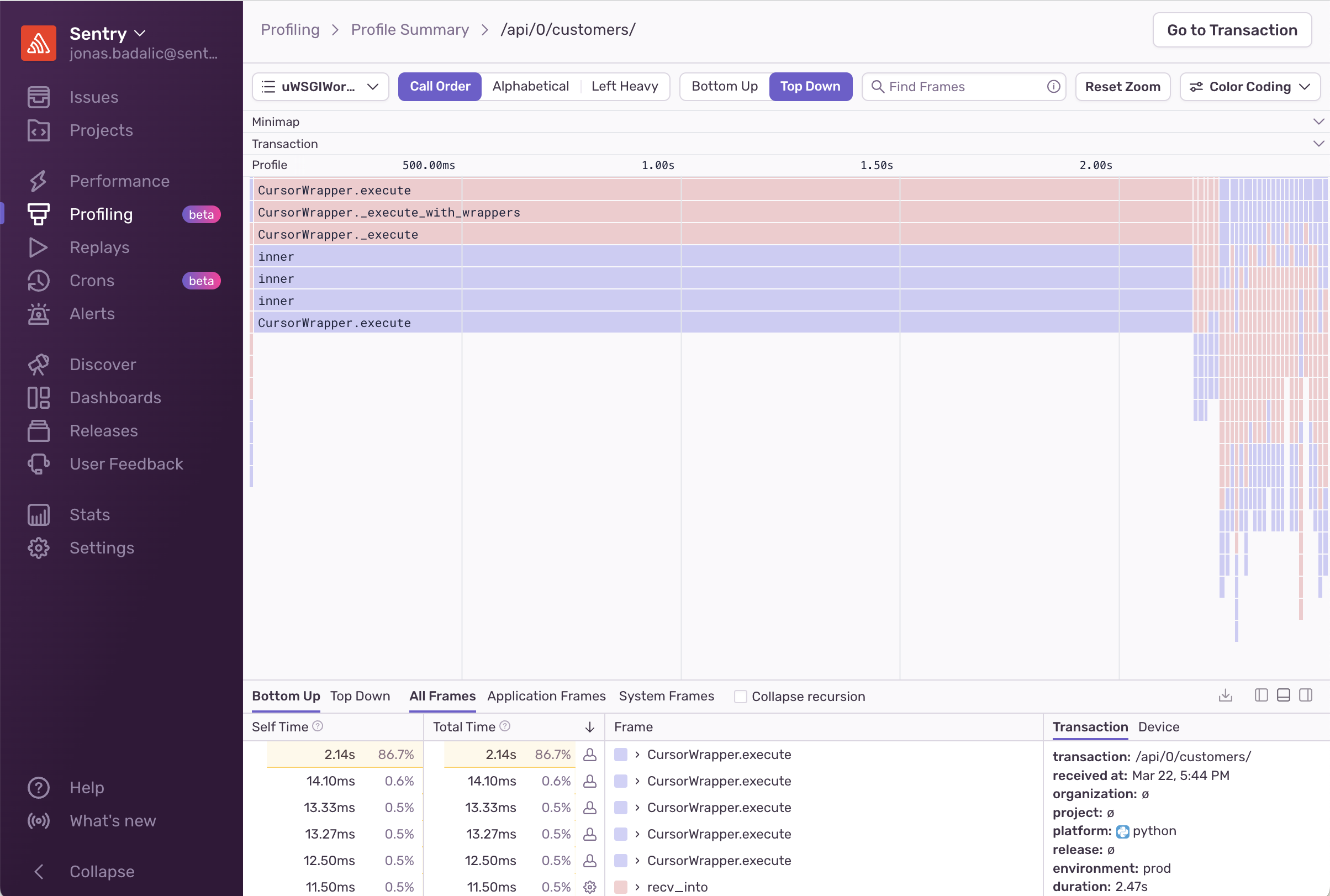 Profiling data can be used to gain insight into what methods and lines of your code are slow. But getting this type of insight requires an understanding of how profiling data is represented and visualized. Sentry uses both flame graphs and aggregated flame graphs to visualize profile data. We'll explain how to read them below.