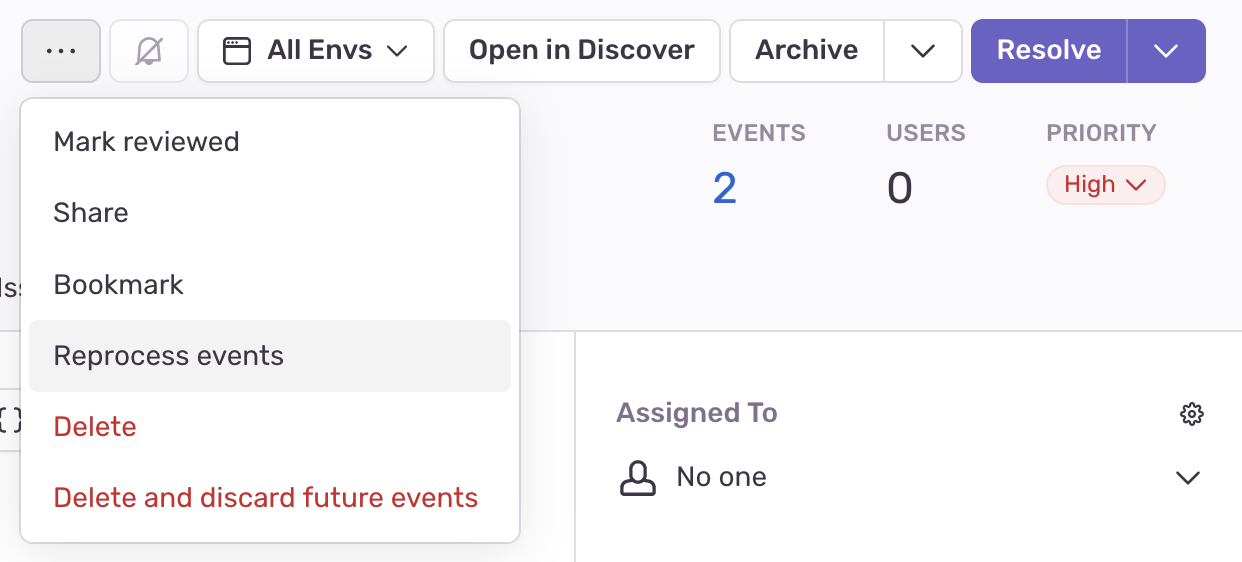 How many events to reprocess: When left empty, all events are reprocessed and potentially move to other (new or existing) issues if the stack trace changed significantly. If you provide a number, for example, 20, then the 20 most recent events are reprocessed, and any remaining events are left as-is.